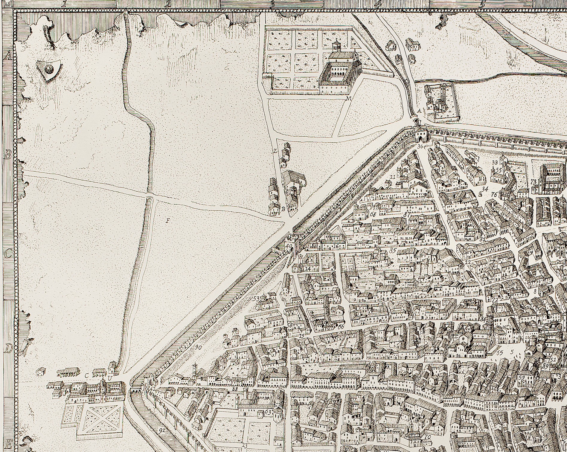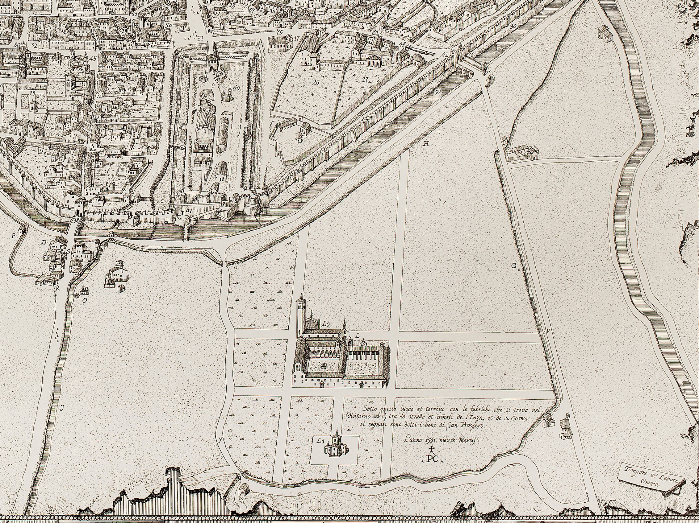 E’ quindi questa la circostanza che conferisce particolare rilievo alla mappa del Camuncoli: essa consente ancora di vedere come fossero la città e il suo suburbio prima dello scempio che li privarono di un ricco e antico patrimonio artistico. Toccanti sono pure le circostanze nelle quali fu realizzata nel 1591. Non si sa se sia stata commissionata o eseguita di propria iniziativa, ma, in un momento cupo e tragico, caratterizzato dalla carestia e da potenti terremoti, era un Camuncoli ormai alla fine della vita quello che, servendosi evidentemente di rilievi precedenti, raffigurò una città che non c’era più.