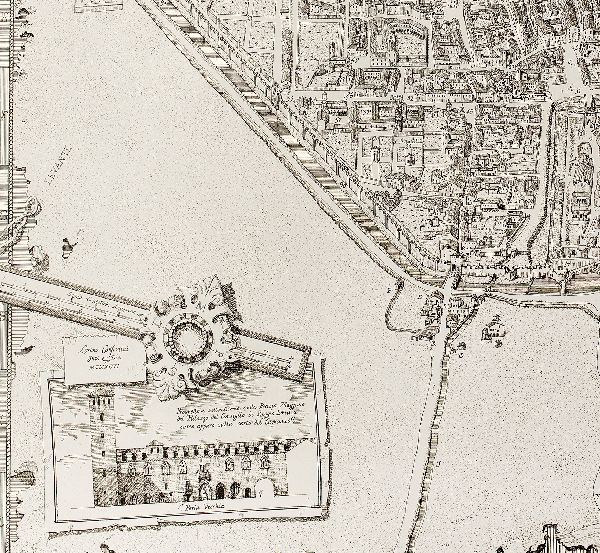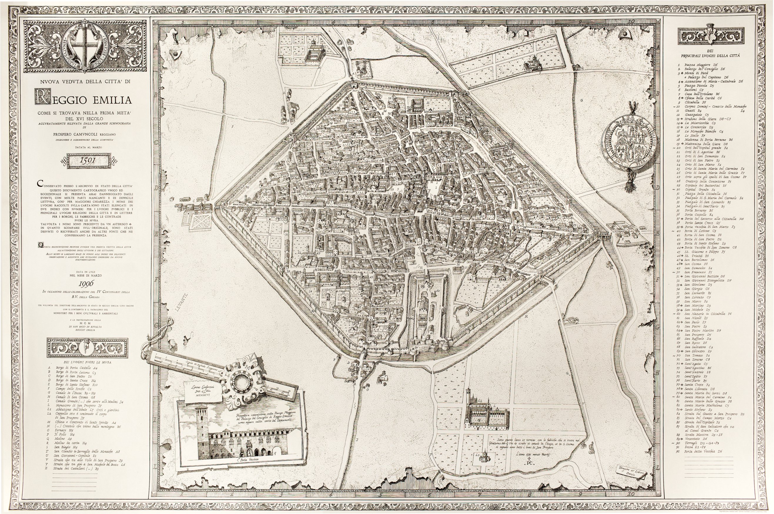 Nel 1542 Prospero Camuncoli, agrimensore, era nominato nel collegio dei periti incaricati dei lavori di sistemazione e arginatura del Crostolo e del Canalazzo, ma la sua committenza principale fu quella del 1551 ad opera del duca Ercole II: la misurazione e la contabilità per la riforma delle mura di Reggio, opera determinata da esigenze strettamente militari, e destinata a cambiare profondamente il volto della città. Dalle carte risulta che proprio in questa occasione, il Camuncoli abbia realizzato una mappa del territorio di Reggio fra il 1551 e il 1552, prima quindi che terminassero i lavori della “tagliata”, cioè dell’abbattimento degli edifici esterni alla cinta muraria, e si pensa che essa sia servita da base per la raffigurazione a noi pervenuta.